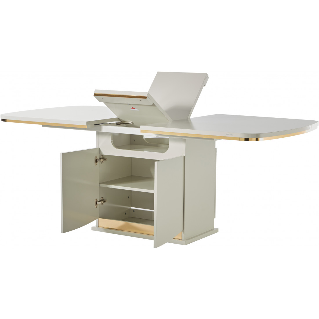 В нижней части стола спроектирована скрытая зона хранения, состоящая из отсеков с полками