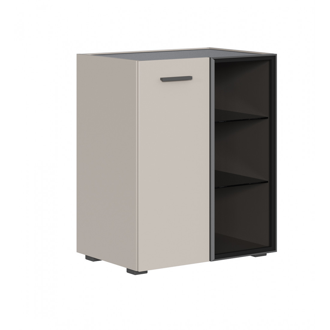 •  Один фасад глухой из ЛДСП Кашемир серый, другой рамочный – профиль алюминиевый, стекло затемнённое;