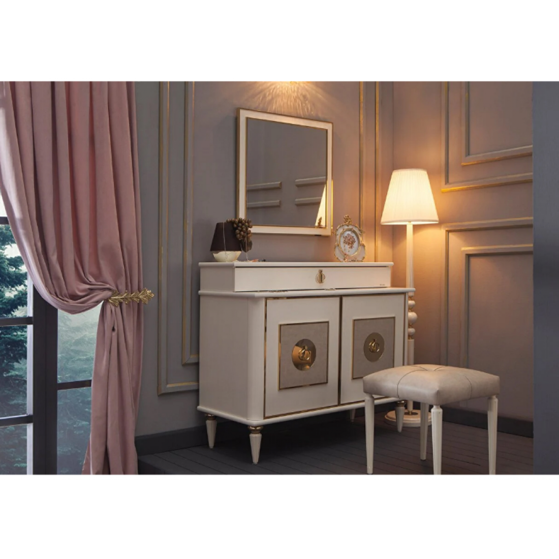 Комод- туалетный столик Mistral дополнит вашу спальню. В вернем ящике- разделитель отделанный тканью для украшений (можно не ставить), за дверцами- деревянная полка
