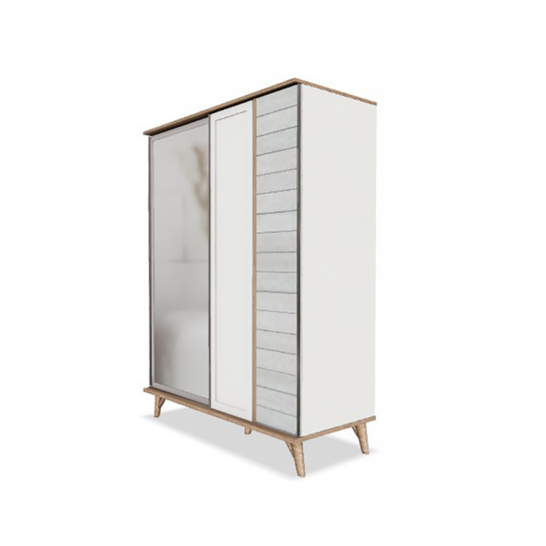 Шкаф-купе платяной шкаф Mavenna изготовлен из высококачественного ЛДСП производства Турция, класс эмиссии формальдегидов Е1. Одна зеркальная дверь, одна- бежевая с серой имитацией деревянных досок. Наполнение шкафа- 2 полки+ штанга в широком отделении слева, штанга и 2 полки с разделителем в широком отделении справа. Двери с доводчиками.