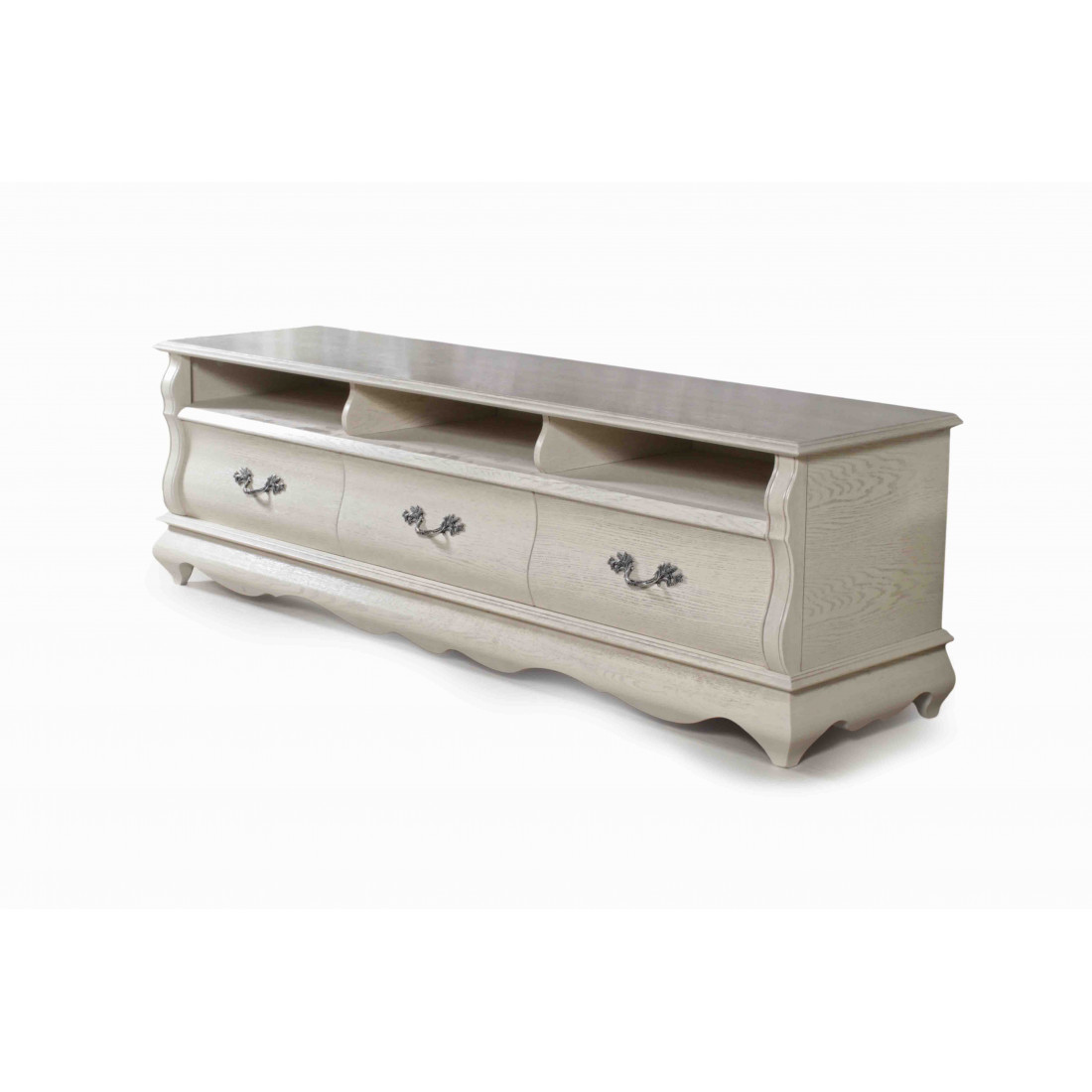 Оригинальная широкая тумба для гостиной из коллекции классической мебели "Оскар" оптимальный вариант для интерьера Вашей комнаты. В декор модели входят резной каркас и плавные изгибы фасада. Три выдвижных ящика на направляющих. Модель выполнена с использованием массива и шпона дуба и окрашена в оттенок "Белая эмаль с патиной".