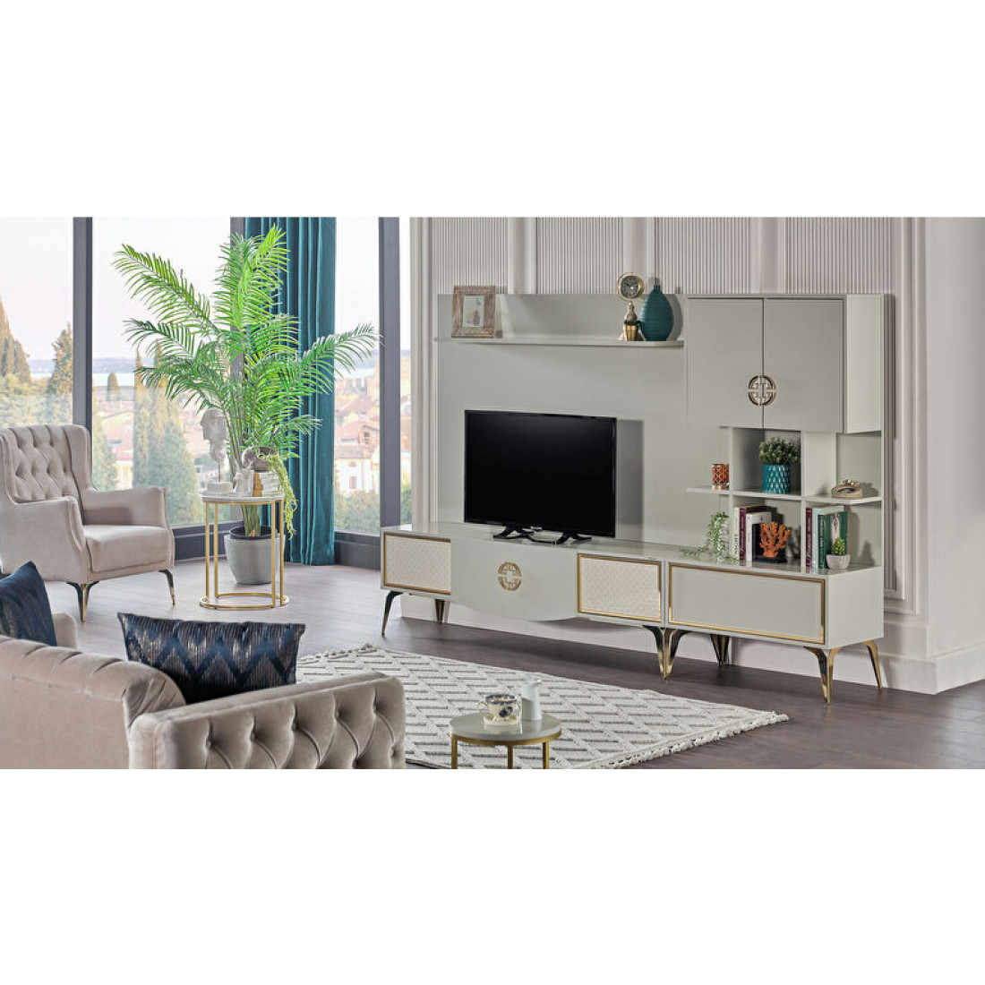 Тумба под ТВ Валеско с рисунком в стиле АРТ-ДЕКО, золотисто-желтыми фитилями, металлическими ручками,ножками